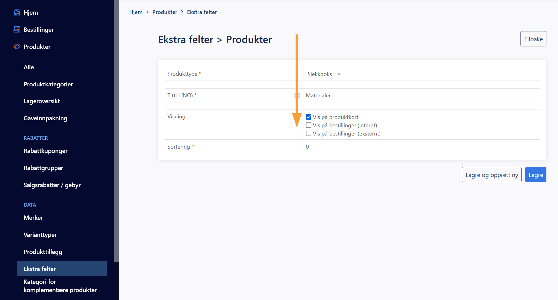 Klikk på Produkter, og opprett eller rediger det ønskede produkt hvor ekstra feltet skal legges til: