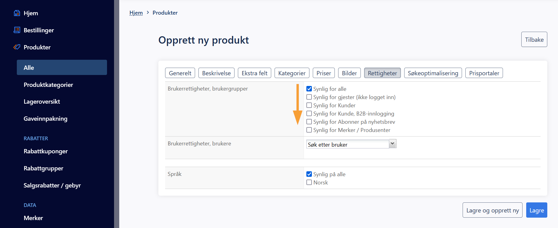 Sørg for at produktet er tilgengelig for den ønskede kundegruppe (standard er "Synlig for alle"):